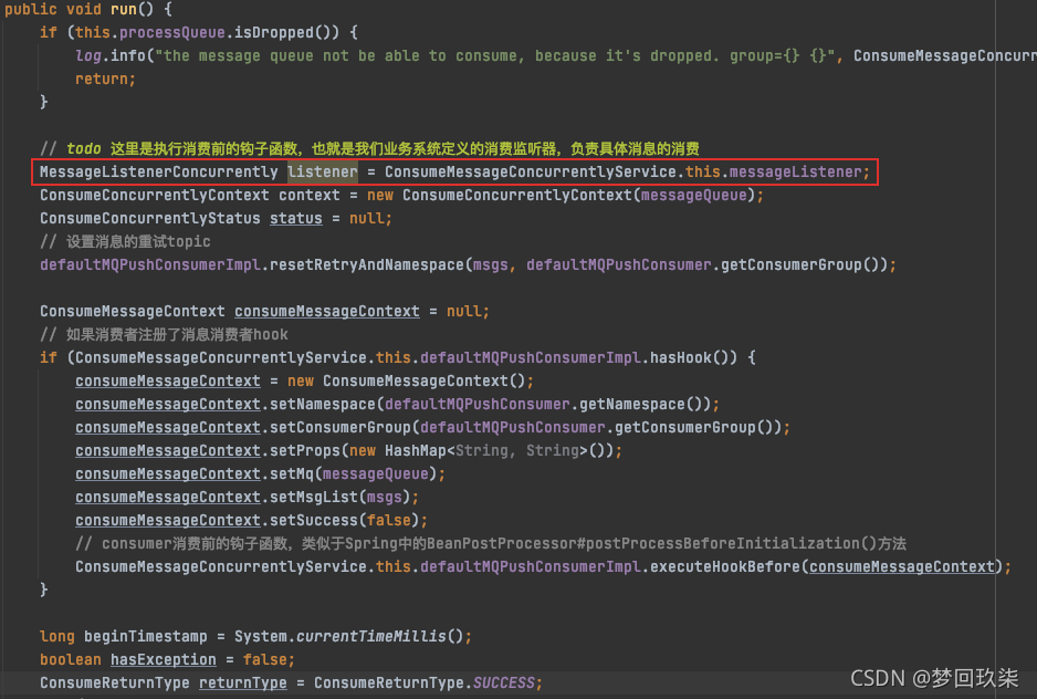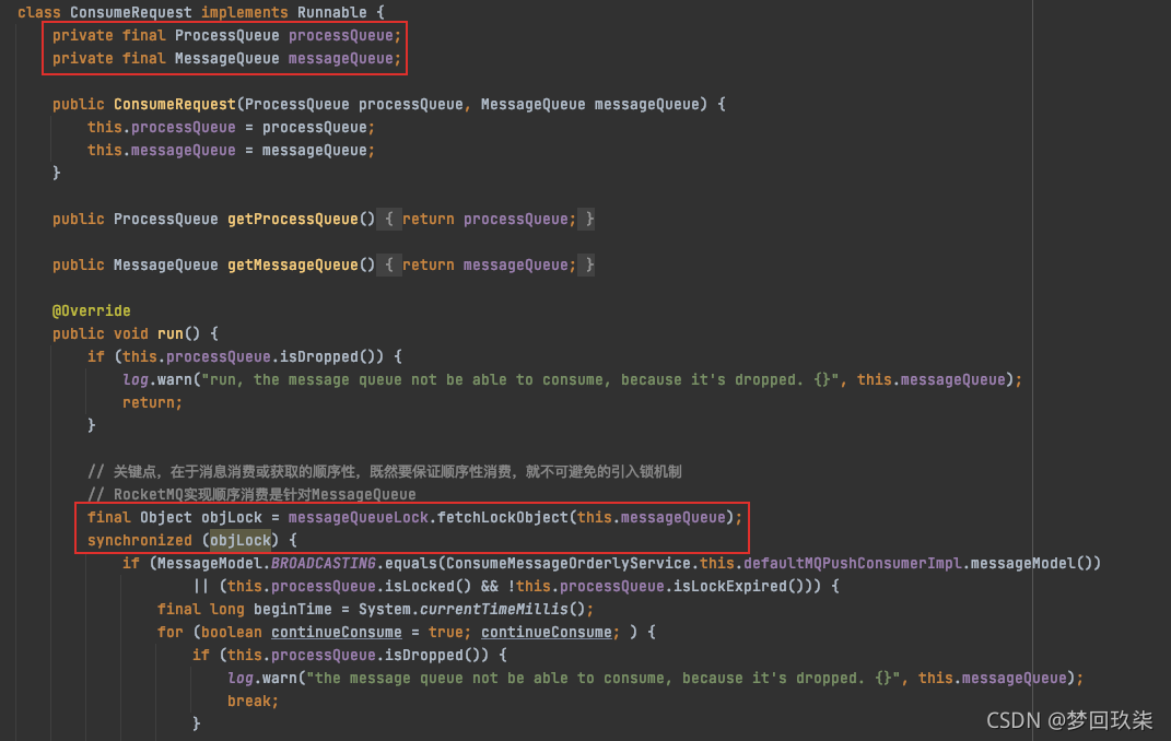 run()方法中消息消费的逻辑与非顺序消费差不多,但其关键点在于消息的消费/获取的顺序性,所以就不可避免的引入锁机制。