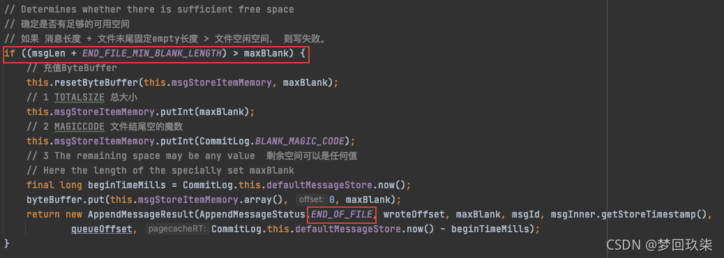 >3. 判断MappedFile中的可用空间是否可以容纳下要追加的消息,如果不可以,返回错误码END_OF_FILE。