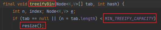 final void treeifyBin(Node<K,V>[] tab, int hash) {