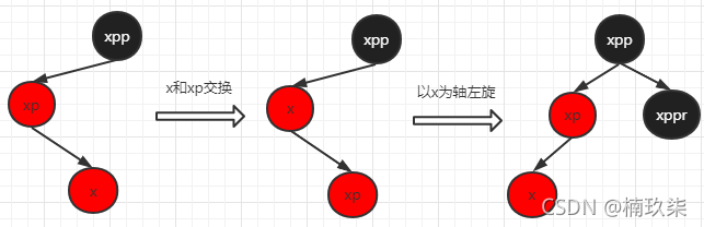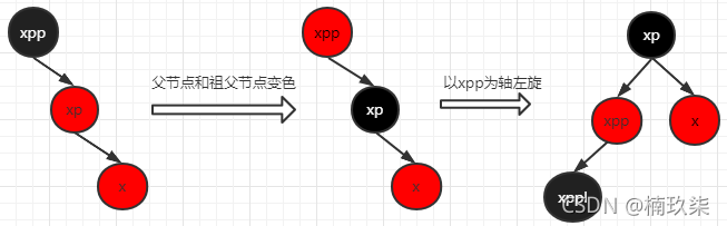 (2)步骤二:父节点和祖父节点变色,以祖父节点xpp为轴左旋;