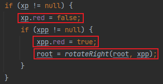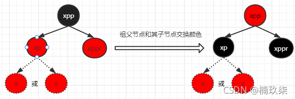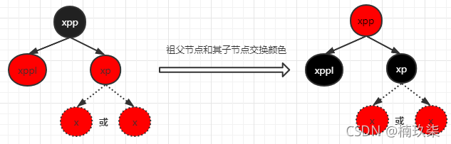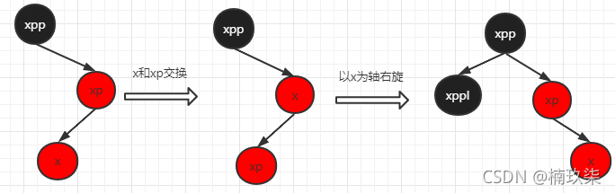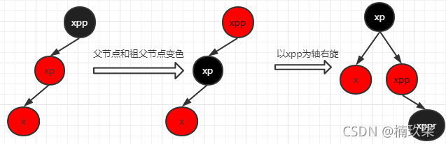 (2)步骤二:父节点和祖父节点变色,以祖父节点xpp为轴右旋;