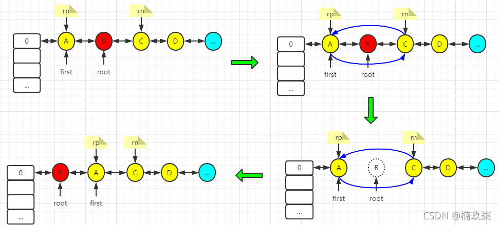 重塑双向链表的连接,把root放到整个链表的头位置,并将root插入到table数组中;