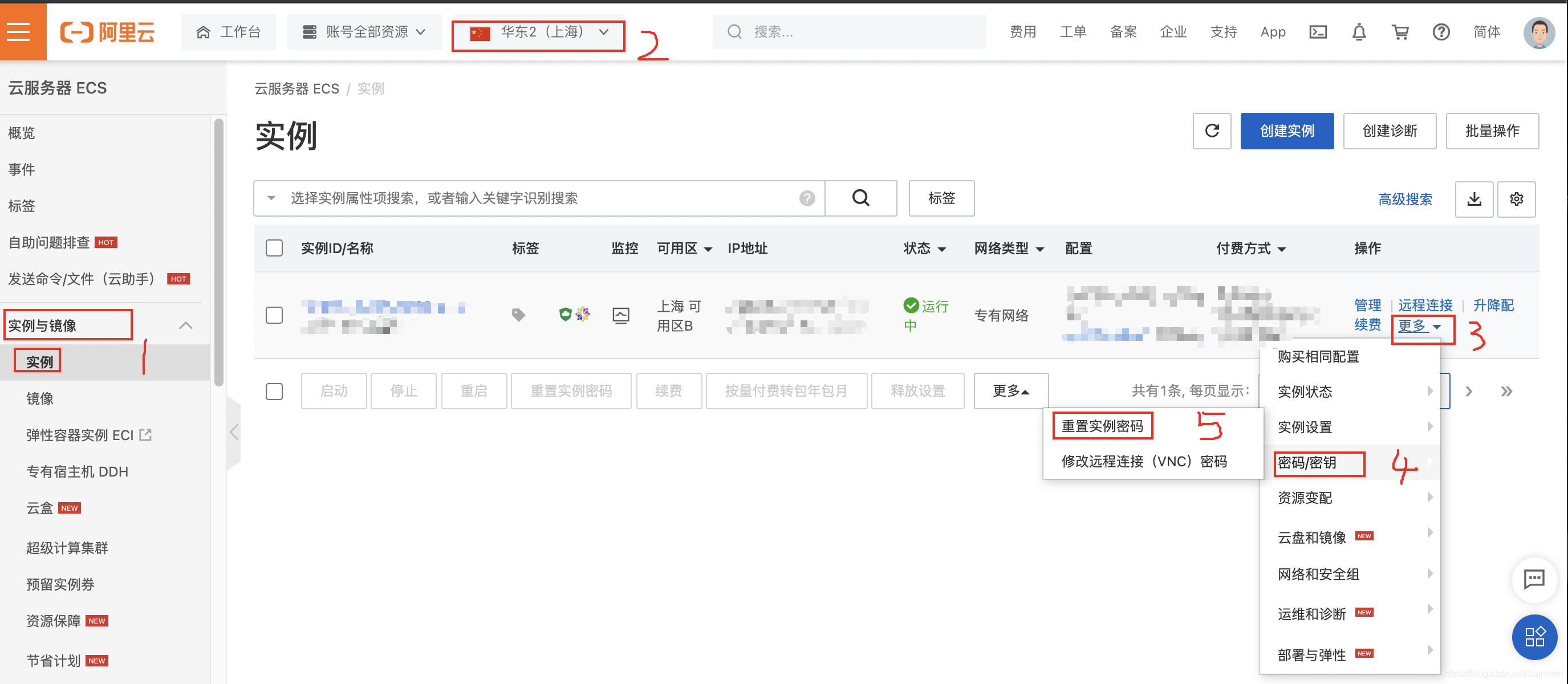进入 实例与镜像 --> 实例,然后选择购买的实例地址(如图,我的是华东2) --> 更多 --> 密码/秘钥 --> 重置实例密码