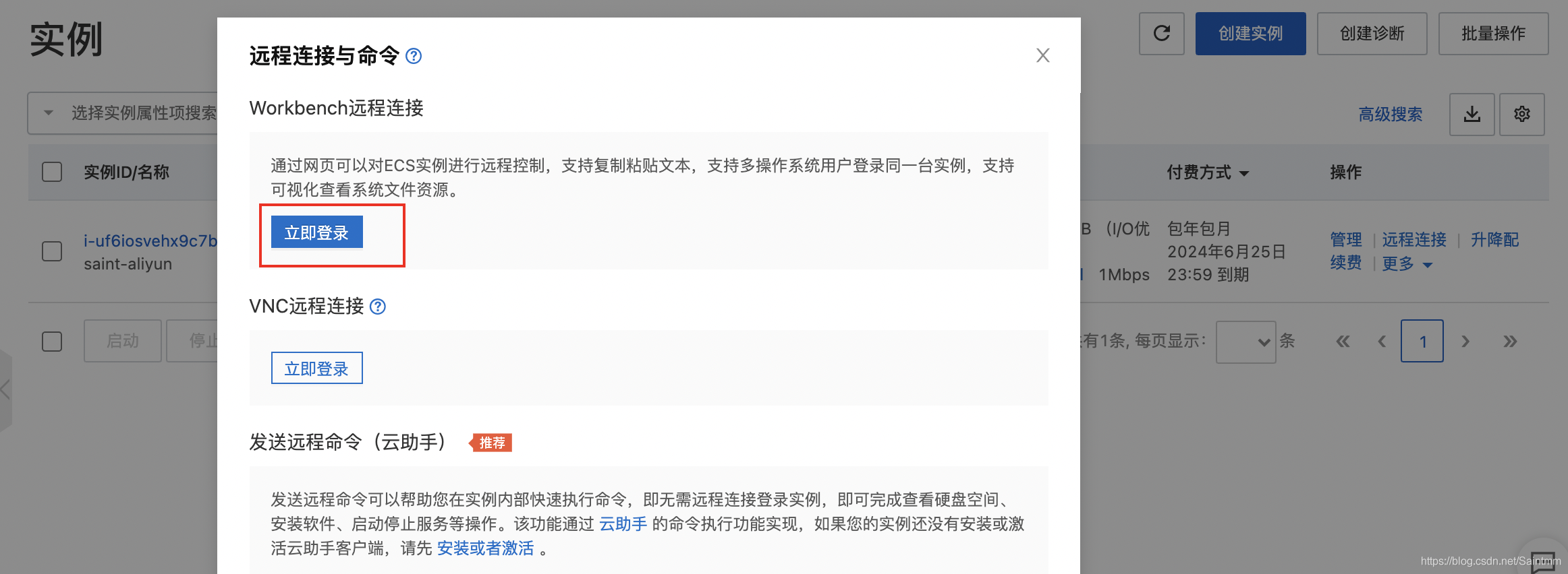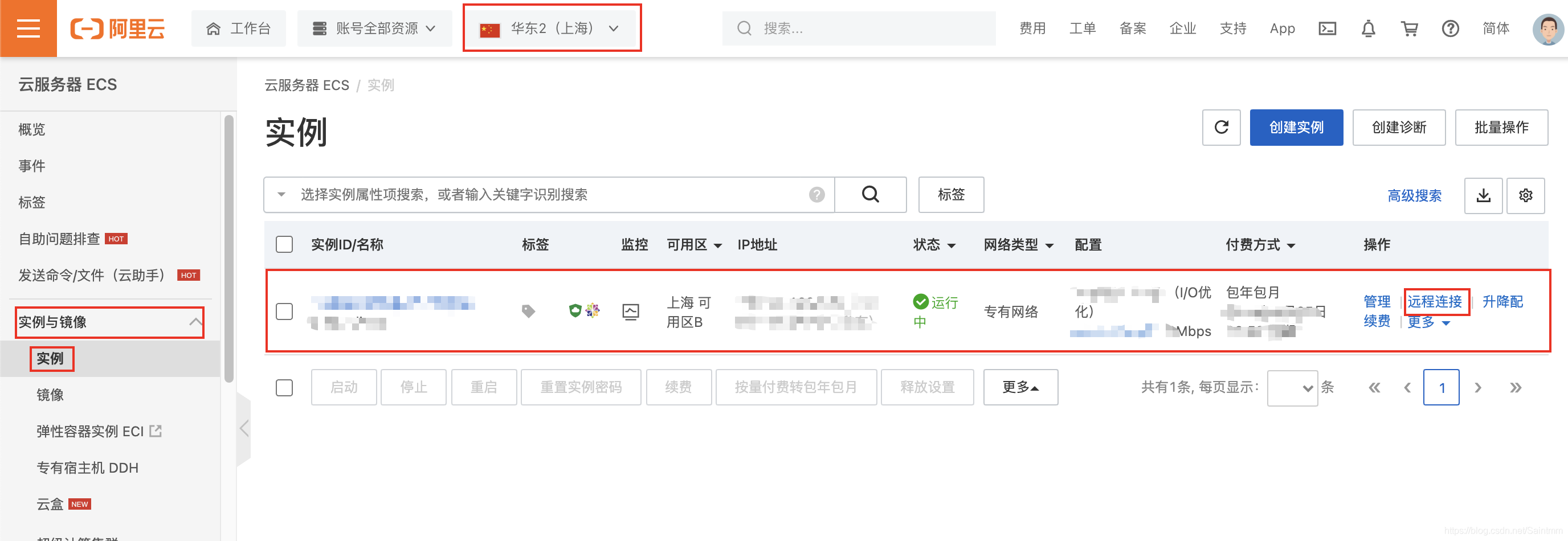 进入 实例与镜像 --> 实例,然后选择购买的实例地址(如图,我的是华东2),然后点击实例上的的远程链接按钮。