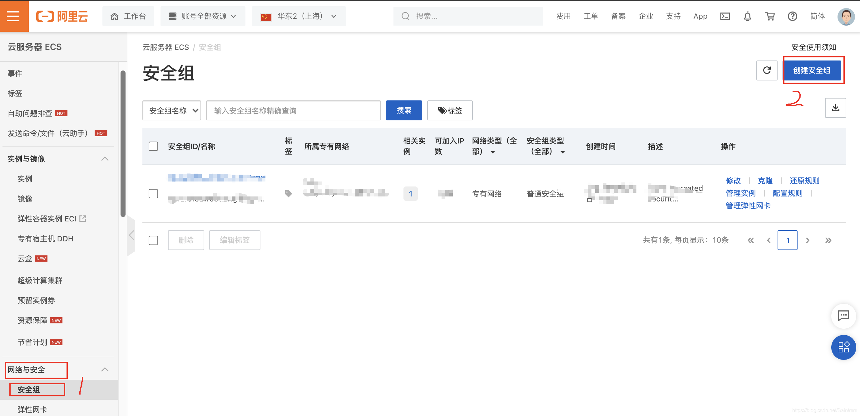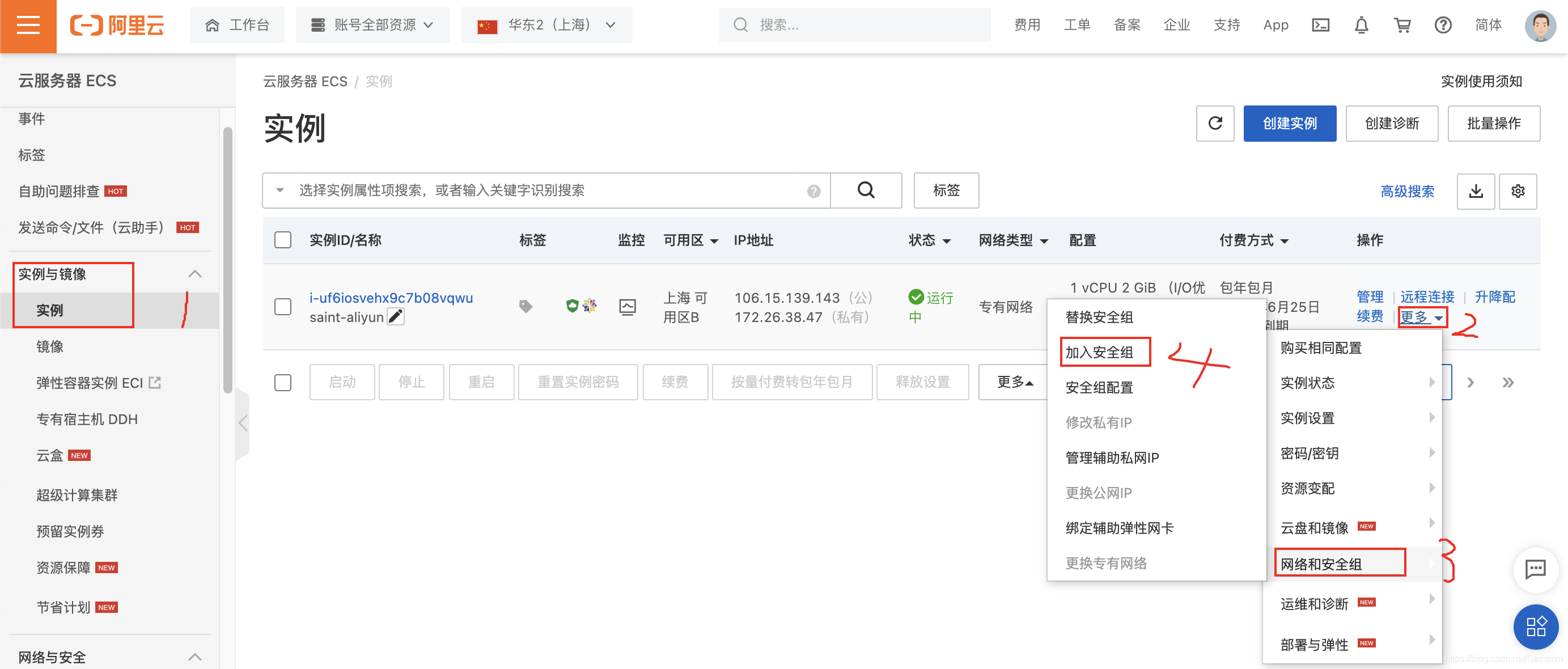 创建安全组成功之后,回到实例列表页面,将创建成功的安全组绑定单我们的实例上。