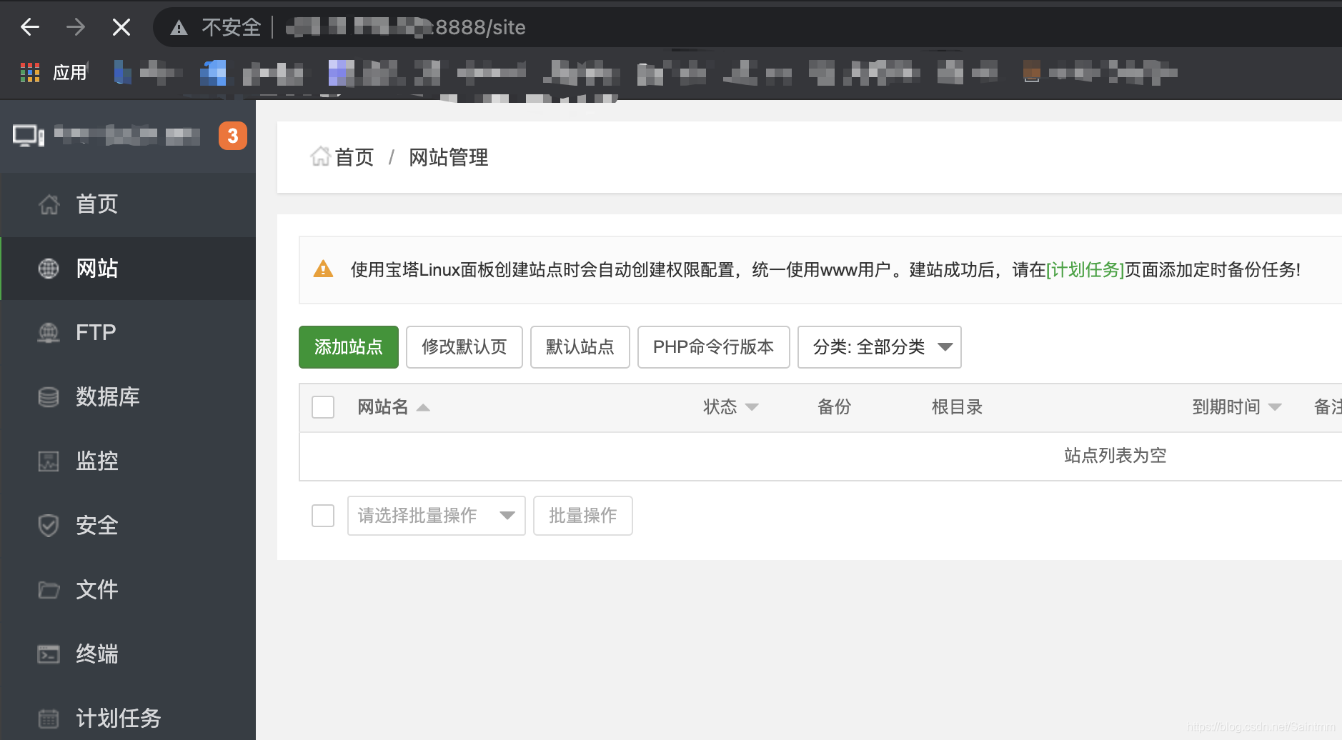 当我们访问相应的外网面板地址:http://云服务器公网IP地址:8888/时发现,登不上啊,我丢。
