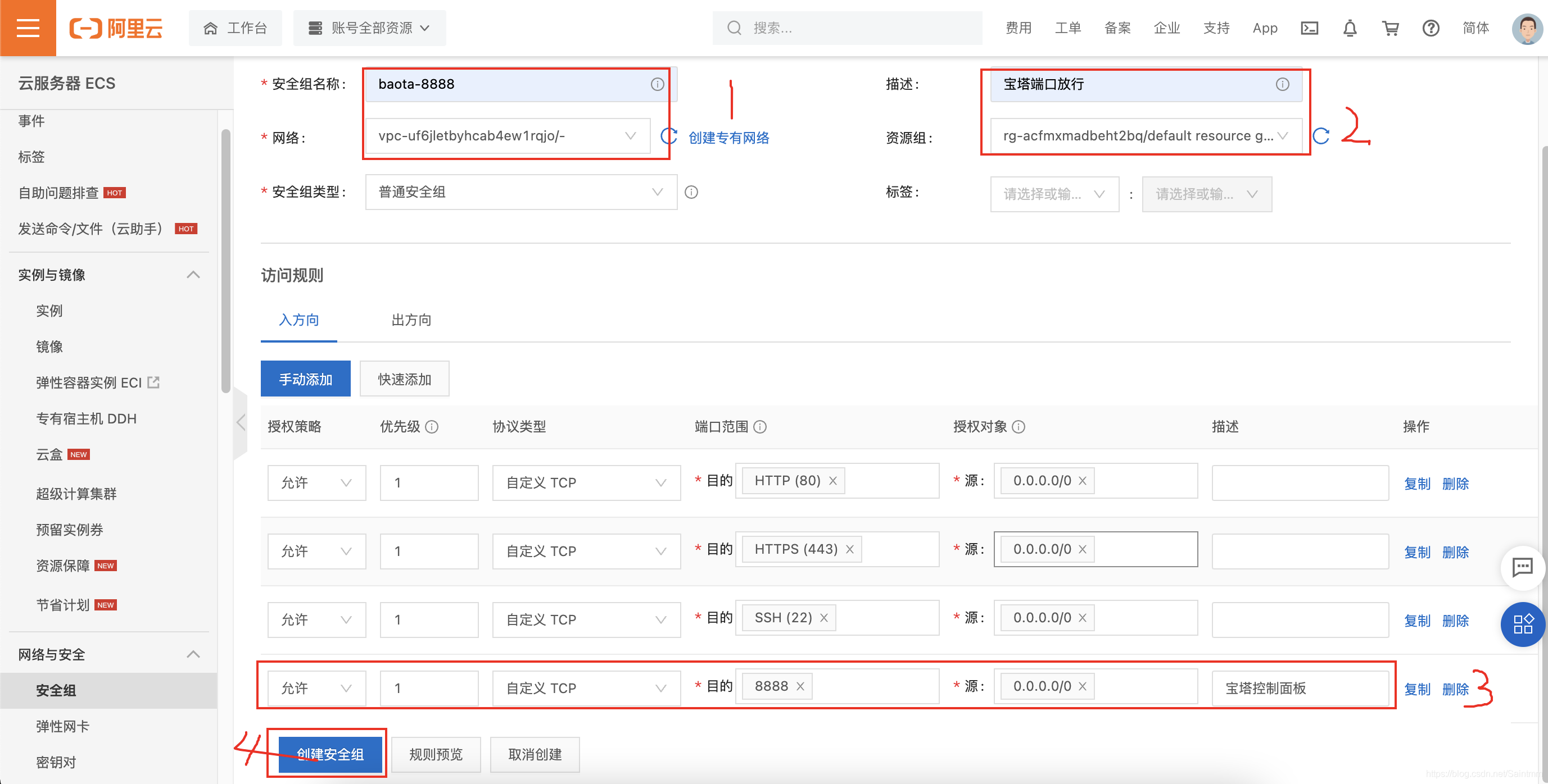 查验发现:阿里云的安全组没有放行8888端口所致 而访问宝塔需要8888端口是放行的。所以我们要进入到阿里云控制台 放行8888端口才能访问到面板。