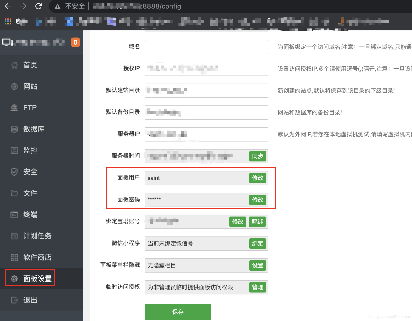 为了安全考虑,在云服务器上安装完成宝塔面板之后,你应该马上修改你的宝塔面板登录账户和密码(注意:这个账户和密码不是宝塔面板官网的,而是每个云服务器访问宝塔面板需要用到的账户和密码)。