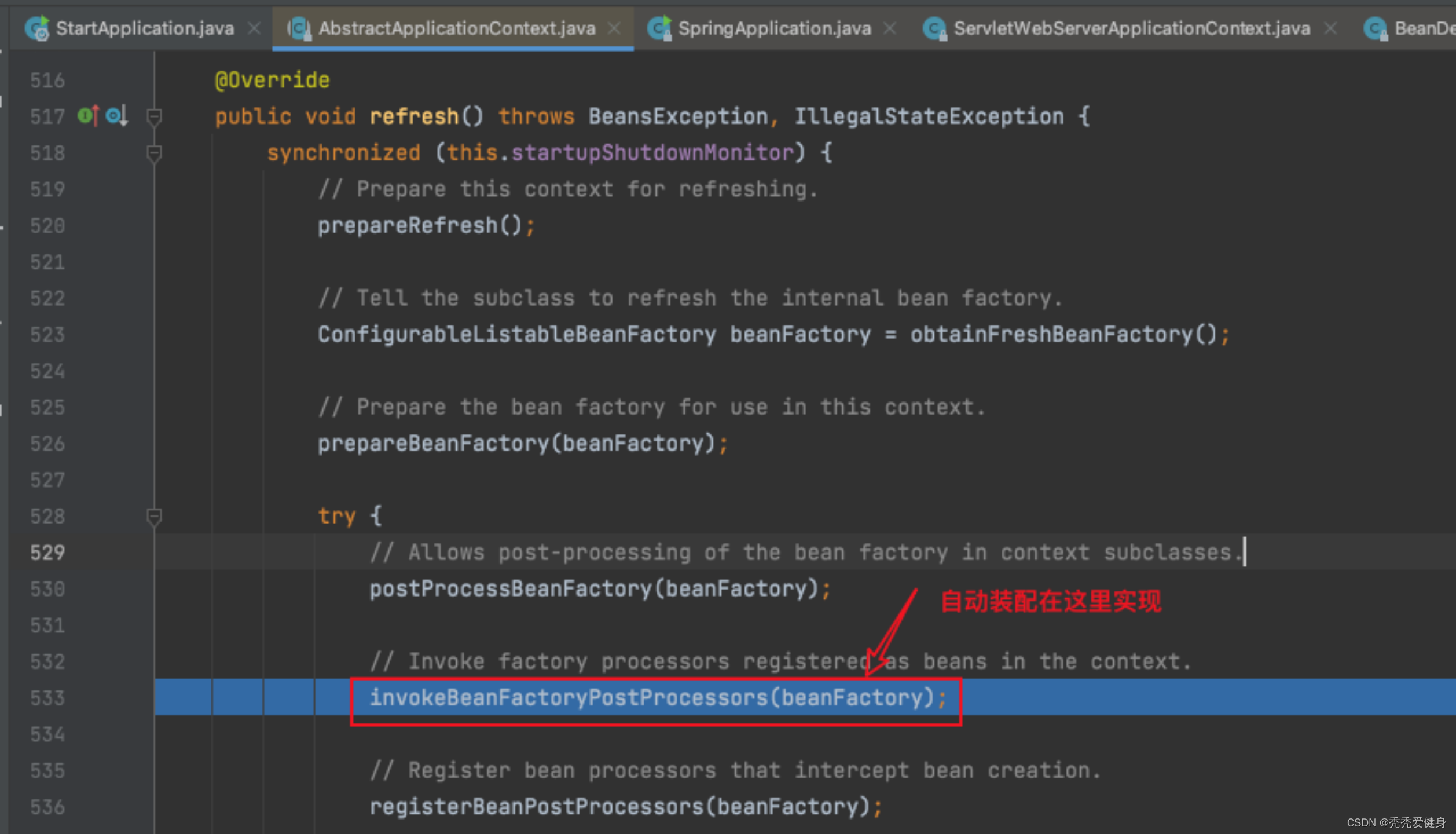 ServletWebServerApplicationContext间接继承自AbstractApplicationContext,所以最终会进入到AbstractApplicationContext#refresh()方法。