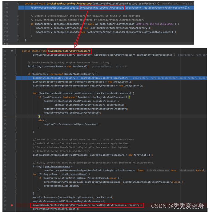 最终进入到PostProcessorRegistrationDelegate#invokeBeanFactoryPostProcessors(ConfigurableListableBeanFactory,List<BeanFactoryPostProcessor>)方法中,自动装配在其中实现;