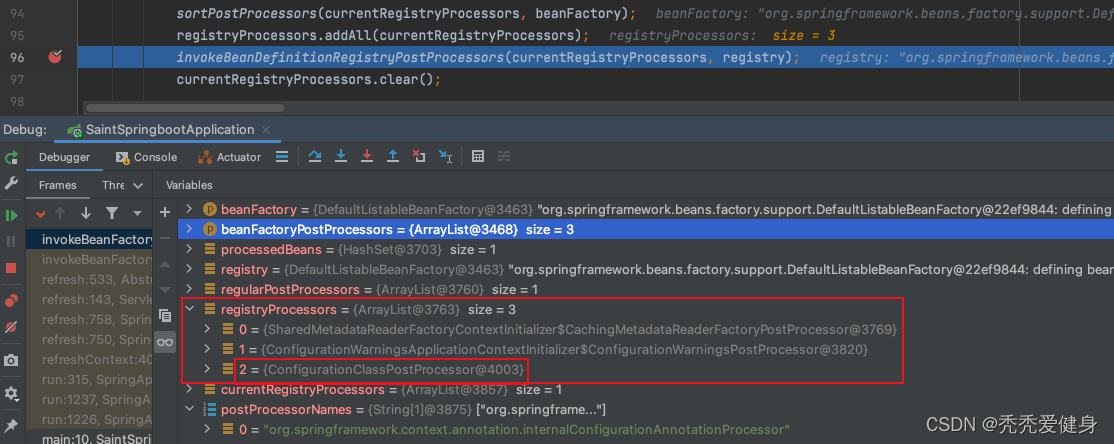 接着从BeanFactory中获取到BeanDefinitionRegistryPostProcessor的实现类ConfigurationClassPostProcessor,并将其添加到registryProcessors中;此时registryProcessors中有三个成员: