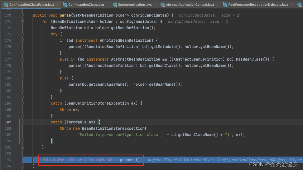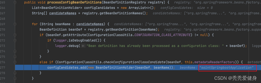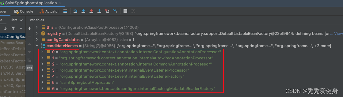 candidateNames中包含了我们的启动类,此外还有6个internalXxx类;然后遍历找到启动类,将其加到configCandidates集合中。