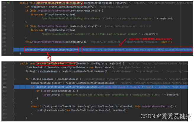 由于postProcessors中只有一个成员ConfigurationClassPostProcessor,进入到ConfigurationClassPostProcessor的postProcessBeanDefinitionRegistry(BeanDefinitionRegistry)方法。