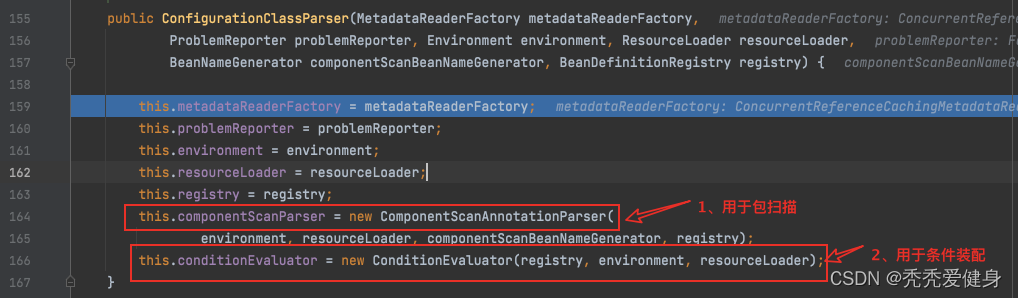 找到启动类(saintSpringBootApplicatioin)之后,构建一个配置类解析器ConfigurationClassParser,其中包括ComponentScanAnnotationParser、ConditionEvaluator,分别用于包扫描和条件装配;