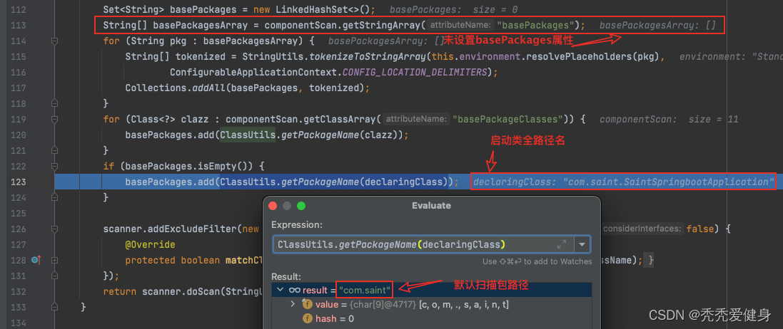 basePackages属性为@ComponentScan注解的默认扫描包路径,如果没指定该属性,则会将启动类所在的包作为默认值 赋值basePackages属性上(以启动类SaintSpringBootApplication为例,其默认扫包路径为:com.saint)。