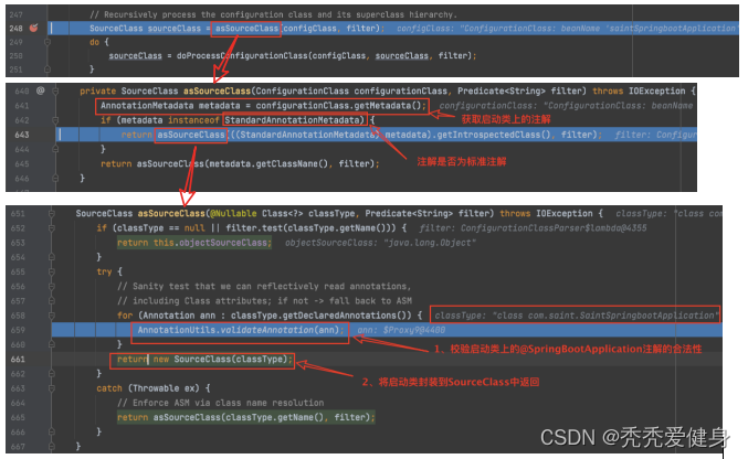 其中会校验启动类上@SpringBootApplication注解的合法性,然后将启动类和其注解元数据AnnotationMetadata封装到SourceClass中返回。