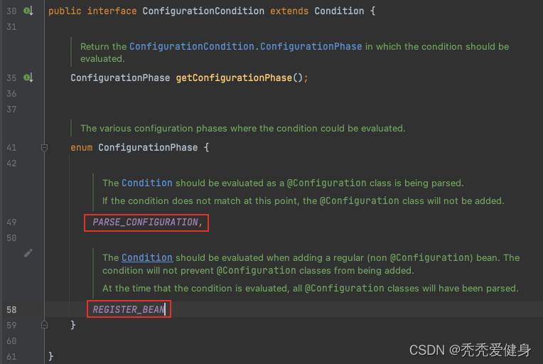 其中在做条件装配时,有个点需要注意一下:ConfigurationCondition接口内部的枚举类ConfigurationPhase中有两个值PARSE_CONFIGURATION、REGISTER_BEAN,分别表示:在类解析阶段做条件装配、在类注册阶段做条件装配。