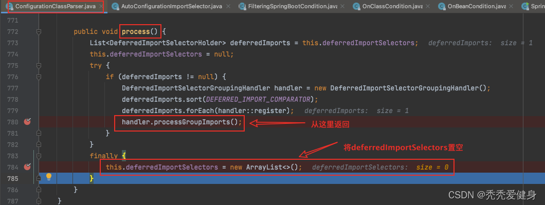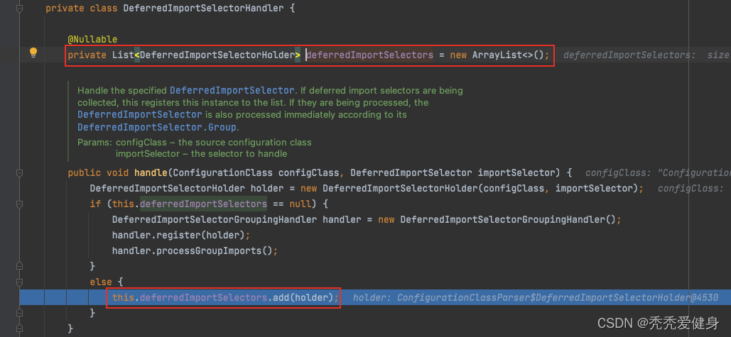 由于AutoConfigurationImportSelector实现了DeferredImportSelector接口,所以会对AutoConfigurationImportSelector进行一个处理:将AutoConfigurationImportSelector封装为DeferredImportSelectorHolder对象,然后添加到ConfigurationClassParser类的deferredImportSelectors属性中(供后面处理@Import内容)。