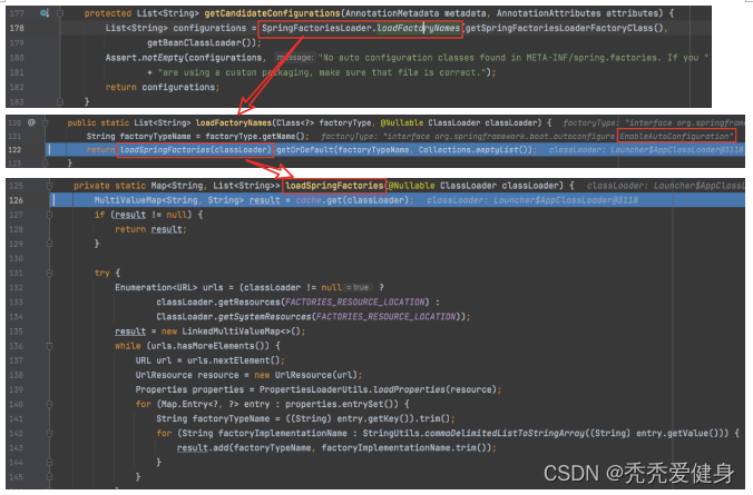紧接着,SpringFactoriesLoader.loadFactoryNames(Class<?>, ClassLoader)方法会获取所有META-INF/Spring.factories的配置文件,进而获取到所有的自动装配类;