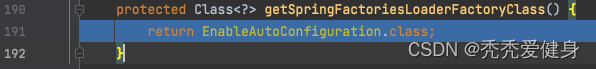 getSpringFactoriesLoaderFactoryClass()方法返回我们熟悉的EnableAutoConfiguration注解类;