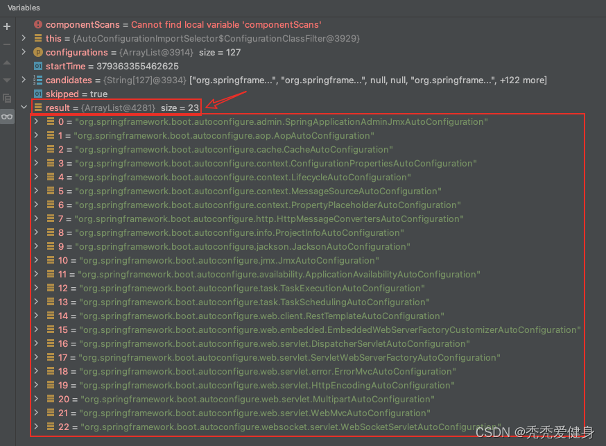 然后对获取到的所有自动装配类(最干净、最简单的SpringBoot程序有127个)执行过滤操作(条件装配)后,还剩23个自动装配类。