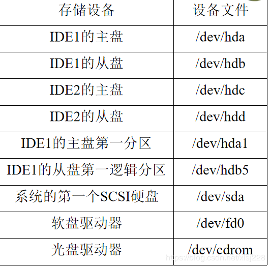 在Linux中,对于IDE磁盘,使用“hd”表示,并且在“hd”之后使用小写字母表示磁盘编号,磁盘编号之后是分区编号,使用阿拉伯数字表示。主分区的编号依次是1~4,而扩展分区上的逻辑分区编号从5开始。而SATA和SCSI磁盘共同使用“sd”表示。??????????????? 常用存储设备的名称表示如左图所示。