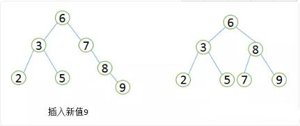 平衡二叉树首先需要符合二叉查找树的定义,其次必须满足任何节点的两个子树的高度差不能大于1。显然图②不满足平衡二叉树的定义,而图①是一课平衡二叉树。平衡二叉树的查找性能是比较高的(性能最好的是最优二叉树),查询性能越好,维护的成本就越大。比如图①的平衡二叉树,当用户需要插入一个新的值9的节点时,就需要做出如下变动。
