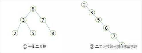 由于二叉查找树可以任意构造,同样的值,可以构造出如图②的二叉查找树,显然这棵二叉树的查询效率和顺序查找差不多。若想二叉查找树的查询性能最高,需要这棵二叉查找树是平衡的,也即平衡二叉树(AVL树)。