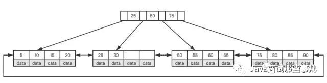 一种行之有效的解决方法是减少树的深度,将二叉树变为m叉树(多路搜索树),而 B+Tree就是一种多路搜索树。理解 B+Tree时,只需要理解其最重要的两个特征即可:第一,所有的关键字(可以理解为数据)都存储在叶子节点( LeafPage),非叶子节点( IndexPage)并不存储真正的数据,所有记录节点都是按键值大小顺序存放在同一层叶子节点上。其次,所有的叶子节点由指针连接。如下图为高度为2的简化了的 B+Tree。