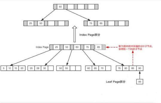 最后插入一个节点95,这时候Index Page和Leaf Page都满了,就需要做两次拆分,如下图所示。