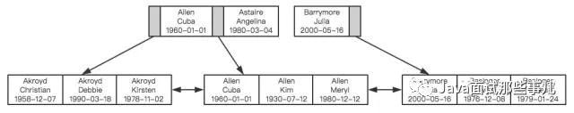 ); 对于表中每一行数据,索引中包含了lastname、firstname、dob列的值,下图展示了索引是如何组织数据存储的。