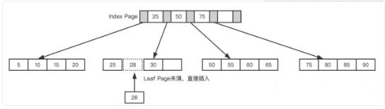 仍以上面的树为例,我们假设每个节点只能存储4个内节点。首先要插入第一个节点28,如下图所示。
