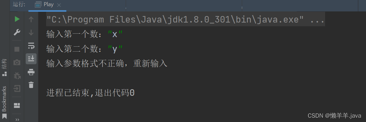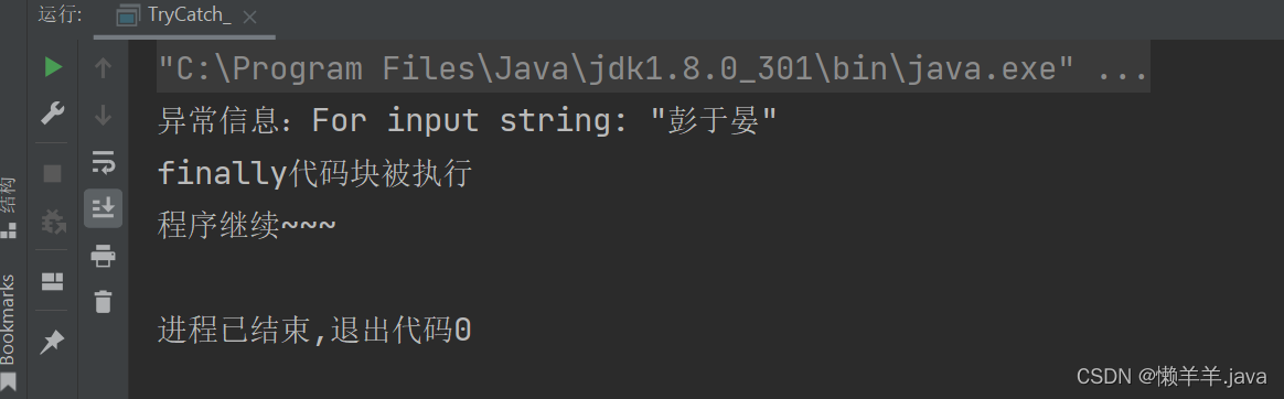 2.出现异常时:try块中的异常发生后,try块中剩下的语句不再执行,将执行catch块中的语句,同理如果有finally,最后要执行finally块里的语句