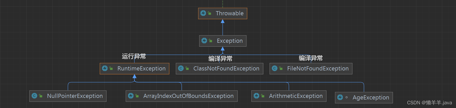 可以看到,异常体系其实是一个继承关系,常见的各种异常都是父类Exception的实现子类,而类所具有的特征Exception类也同样具有,所以我们可以通过实例化异常类的方式来设计异常