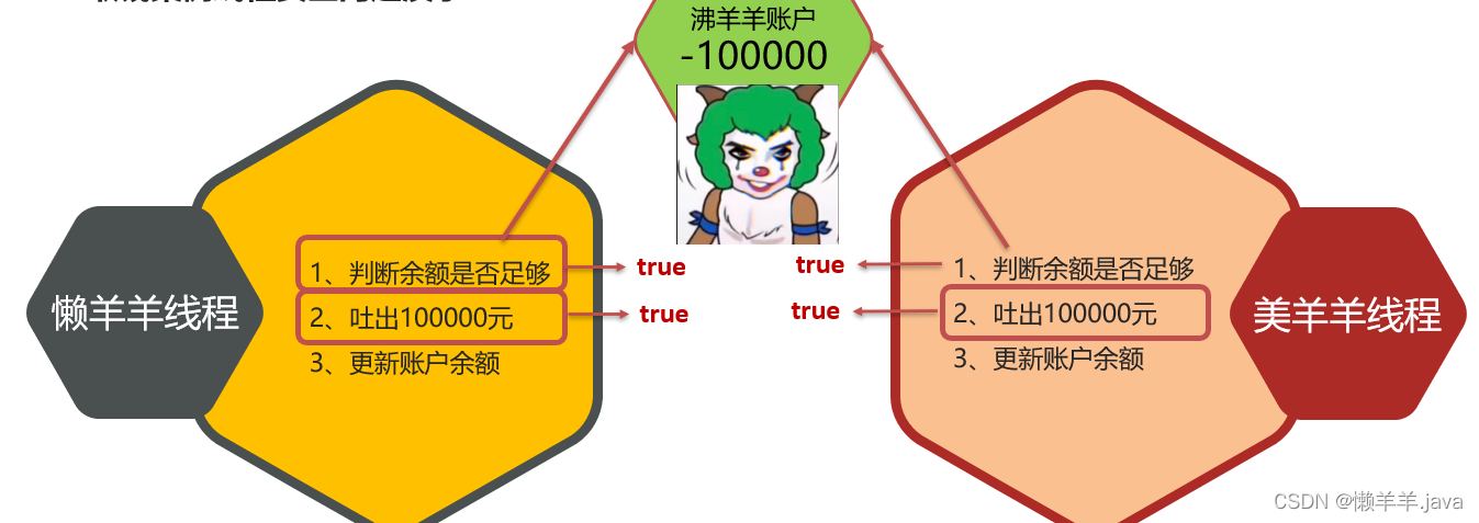懒羊羊、美羊羊同时去取沸羊羊的钱,两个线程同时进行都符合判断条件,结果银行还亏了十万,这就是线程安全引起的生产事故