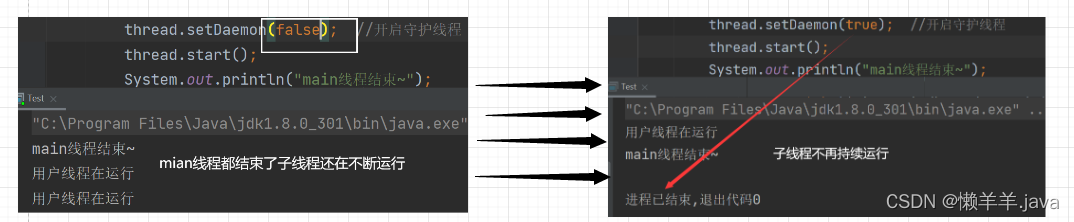 理解这两个概念通过顾名思义的方式再适合不过了,用户线程是一个用户,守护线程是一个守护者时时刻刻守护用户,当用户程序执行完毕守护者就默默退出
