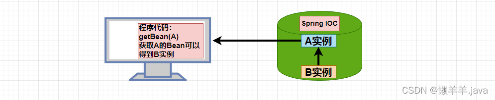 对象A与对象B之间失去了直接联系,当对象A运行到需要对象B的时候,IOC容器会主动创建一个对象B注入到对象A需要的地方