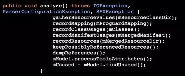 开启shrinkResources后,打包过程会新增task transformClassesWithShrinkResFor{variant},gradle1.5之后只需要注册一个tranform就会产生一个对应的task,查看源码发现对应的tranfrom在com.android.build.gradle.internal.transforms.ShrinkResourcesTransform,此类中调用com.android.build.gradle.tasks.ResourceUsageAnalyzer的analyze方法进行分析无用资源。