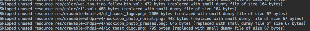 经过上述配置改动后,重新编译查看输出文件,可以看到大量的无用资源。打包过程是将其替换为了一个同名的空文件,但我们可以解析这个文件,找到无用资源,用脚本批量删除。
