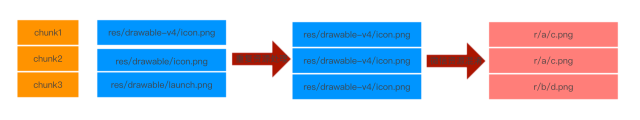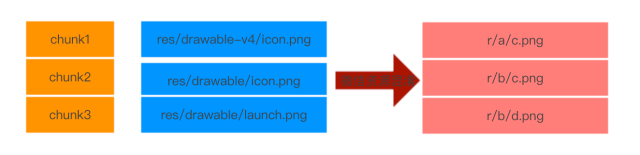 根据错误堆栈可以定位到微信资源混淆出现的位置。阅读微信资源混淆源码,发现映射关系如下:从res/drawable/icon.png到r/a/c.png是一一映射的。每个资源路径可变的有两部分,一是资源类型如drawable,color;另一个是资源名称。映射过程有以下规则,同类型资源会映射到相同目录中,资源id相同也即是同名资源映射后的资源名相同。如下图中,资源1和2是名字相同,映射后的名字都是c.png,资源2和资源3资源类型相同,映射后的资源都在r/b目录下。