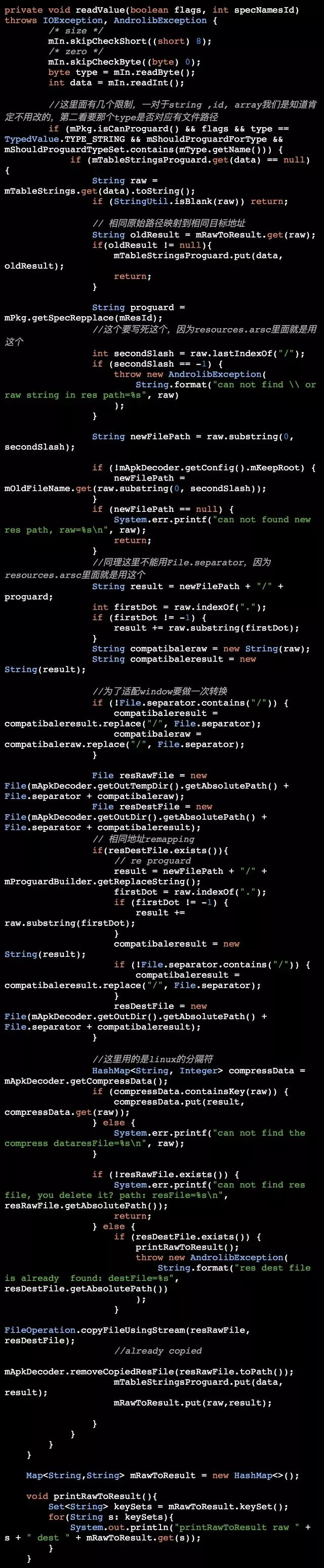 对微信资源处理的逻辑全在com.tencent.mm.androlib.res.decoder.ARSCDecoder的readValue函数中。