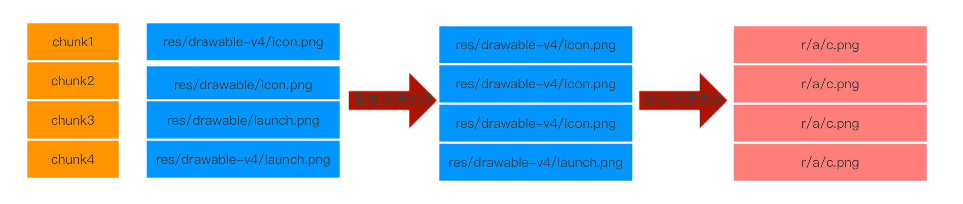 Android开发推崇根据业务拆分多个模块,模块间为了防止资源覆盖,会给每一个模块的资源加一个前缀,同样的资源就会在apk包中出现多次。阅读微信资源混淆源码时发现,它将每个资源Chunk中的资源路径替换为了一个较短的路径。那么对于重复资源,仅仅保留一份,修改arsc文件,重定向Chunk对应的资源路径,就可以解决重复资源问题。