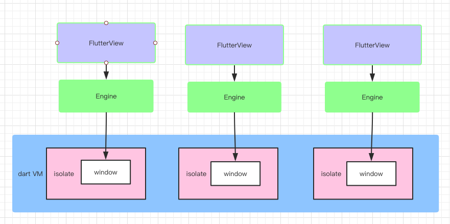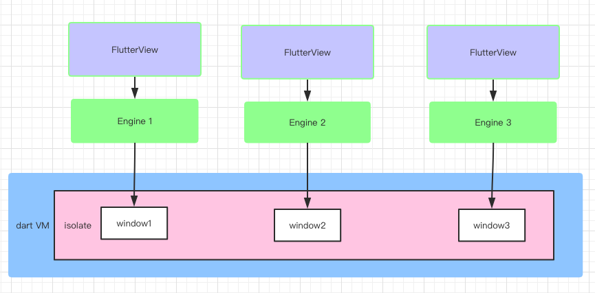 一个Ioslate只有一个ui.window单例对象,只需要做一点修改:把FlutterEngine加入ID的概念传给Dart层,让dart层存在多个window,就可以实现多个FlutterEngine共享一个Ioslate了。