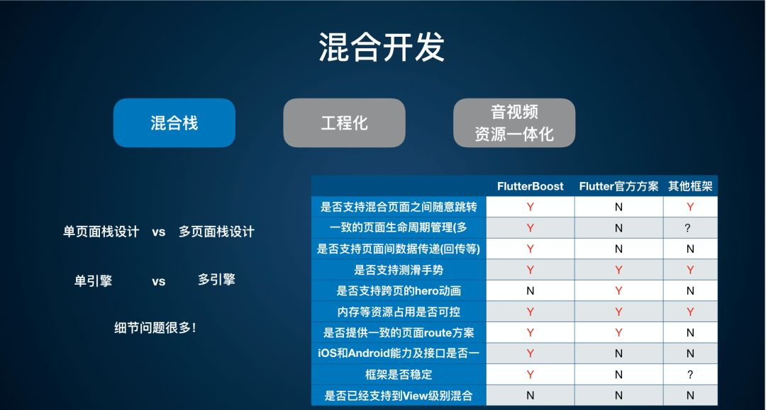 (2)单引擎和多引擎。上面说的多页面栈涉及一个问题,每个 Flutter 页面都挂在一个新的 Activity(以 Android 为例)下,那这些页面的 Flutter 引擎到底是用同一个引擎还是多个引擎呢?这也是混合栈要考虑的重要问题。直观来看,要适应多页面栈,那就用多引擎,每个页面都起一个 Flutter 引擎最简单了,但最大的问题是内存会暴涨,虽然现在官方也想去深度复用这个引擎,让引擎能够很轻量化,但是目前这个还没有 Ready。所以从单、多引擎来讲,目前我们使用的方案还是单引擎的方案。单引擎的方案的优点就是内存省了,所有的 Flutter 都在一个引擎里。