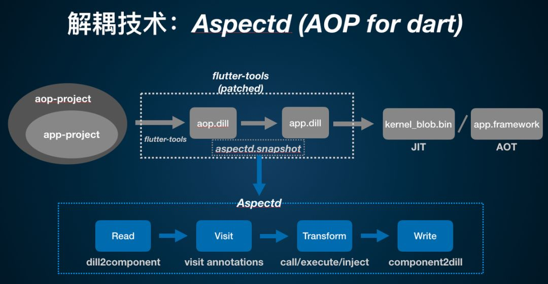 这里详细介绍下解耦时用到的 AOP 技术,AOP 是解侵入的手段, JAVA 和 OC 里这块都容易,但是在 Dart 里没有成熟方案。AOP 的一种解决方案是基于代码生成,另外一种解决方案是在 Dill 里修改,Dill 是 Dart 到最终产物中间的语言。