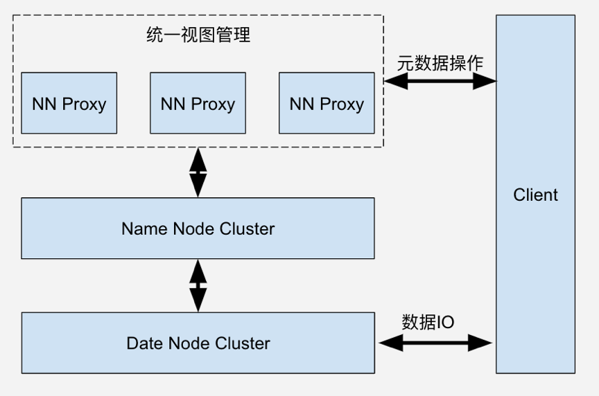 联邦又带来统一命名空间问题,因此,需要统一视图空间帮助业务构建统一接入。这里我们引入了 Name Node Proxy 组件实现统一视图和多租户管理等功能。为了解决这个问题,我们引入了 Name Node Proxy 组件实现统一视图和多租户管理等功能,这部分会在下文的 NNProxy 章节中介绍。
