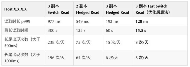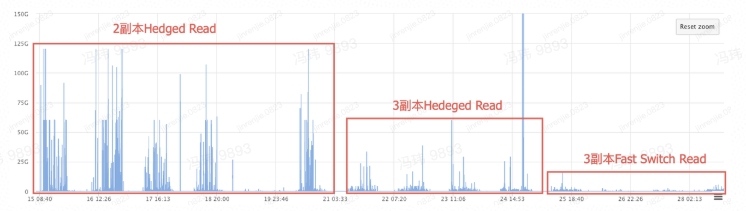 后续,我们研发了 Hedged Read 的读优化。Hedged Read 对每一次读取设置一个超时时间。如果读取超时,那么会另开一个线程,在新的线程中向第二个副本发起读请求,最后取第一第二个副本上优先返回的 response 作为读取的结果。但这种情况下,在慢节点集中发生的时候,会导致读流量放大。严重的时候甚至导致小范围带宽短时间内不可用。