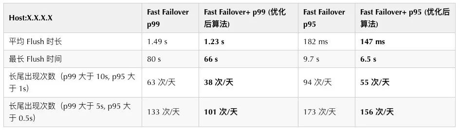 基于之前的经验,我们进一步优化,开启了 Fast Switch Read 的优化,该优化方式使用吞吐量作为判断慢节点的标准,当一段时间窗口内的吞吐量小于阈值时,认为当前节点是慢节点。并且根据当前的读取状况动态地调整阈值,动态改变时间窗口的长度以及吞吐量阈值的大小。下表是当时线上某业务测试的值: