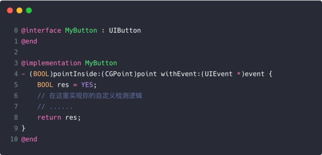 某年某月的某一天,产品小 S 向开发君小 Q 提出了一个简约而不简单的需求:扩大一下某个 button 的点击区域。小 Q 听完暗自窃喜:还好,这是一个我自定义的 button,只需要重写一下 button 的 pointInside:withEvent:方法即可。只见小 Q 手起刀落在产品小 S 崇拜的目光中轻松完成。代码如下:
