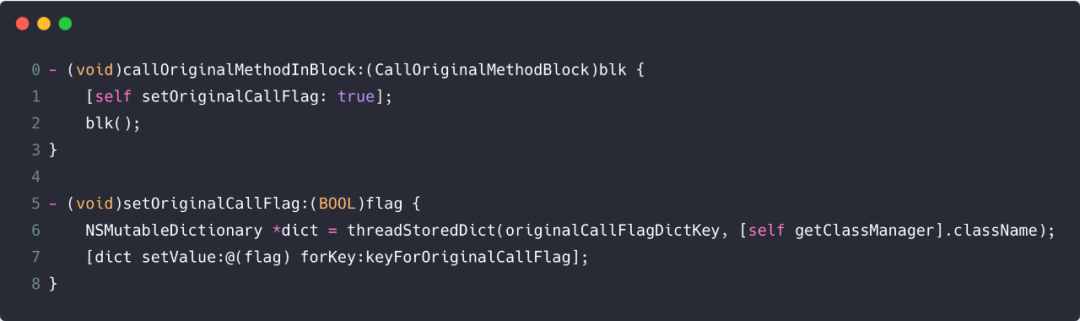 callOriginalMethodInBlock 方法的内部实现其实就是为此次调用加了一个标识符用于在方法调度时判断是否需要调用原始方法,其实现代码如下: